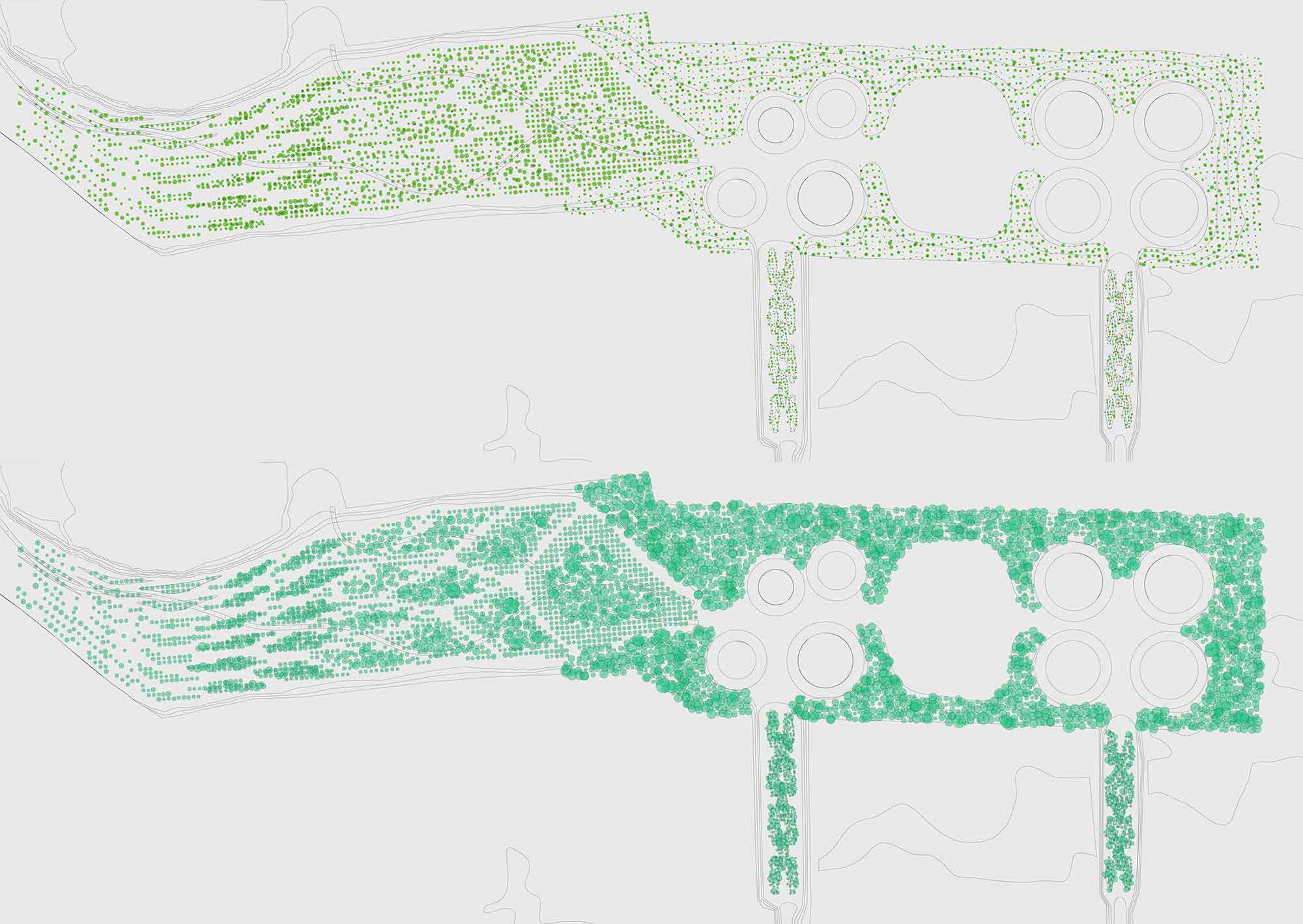 Once a location (in the form of a Point) has been generated for each instance of a species (in the form of the list) these can be fed into the Appearance component. This component then allows for key geometric features of each individual plant to be projected at a specific point in time. At present these visualisation methods are limited to basic circular depictions for criteria such as heights or trunks, root, and canopy radii. While offered as flat linework, many existing Grasshopper tools can be used to assign these projections volume. For instance, the circles that represent canopies can be transformed into spheres or planar surfaces that can then test simple shading effects.